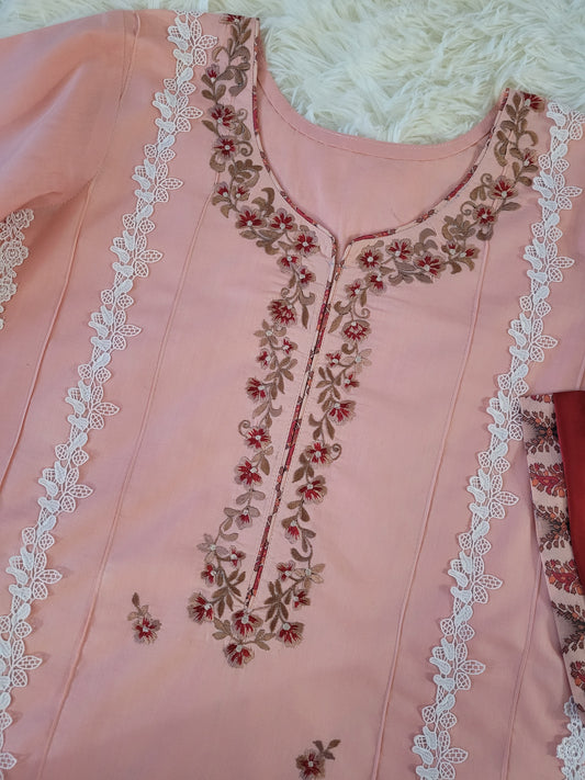 Peach Blossom Embroidered Cambric Suit with Tie-Dye Dupatta