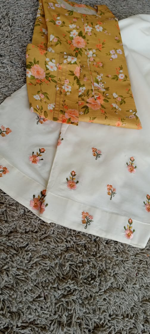 Mustard Ochre: Printed 2-Piece Suit with Embroidered Trousers