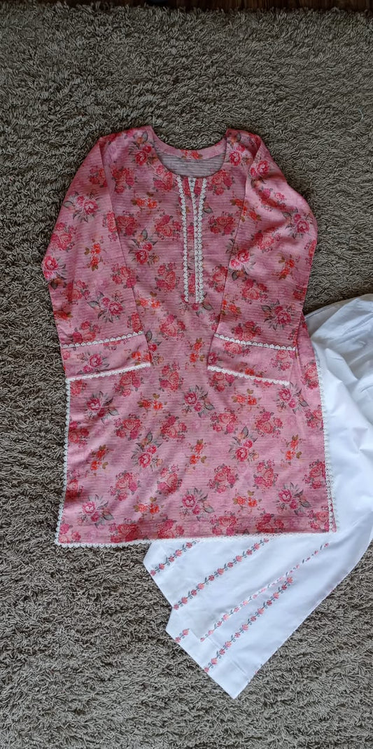 Rose Garden Pink: Printed 2-Piece Suit with Embroidered Trousers