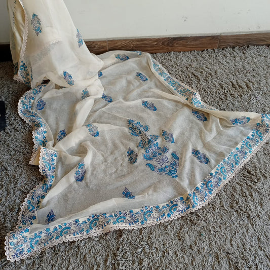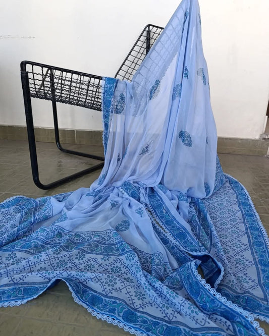 Blue Chiffon Dupatta with Hand Block Motifs & Lace Finish
