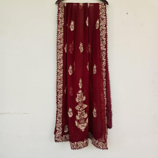 Deep Red Chiffon Dupatta (Hand Stamped Accents with Lace)