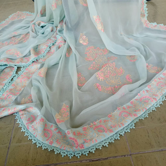 Powder Blue Chiffon Dupatta with Pink & Gold Hand Block Print and Lace Trim