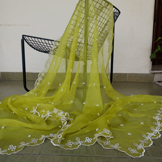 Artisan Lemon Green Organza Dupatta with White Embroidery