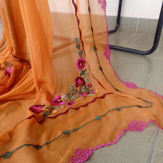 Cream Chiffon Dupatta (Hand Stamped Accents with Lace and Satin Trim)