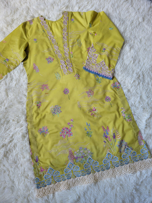 Farah Talib Aziz Embroidered Lemon Green Suit with Watercolor Dupatta