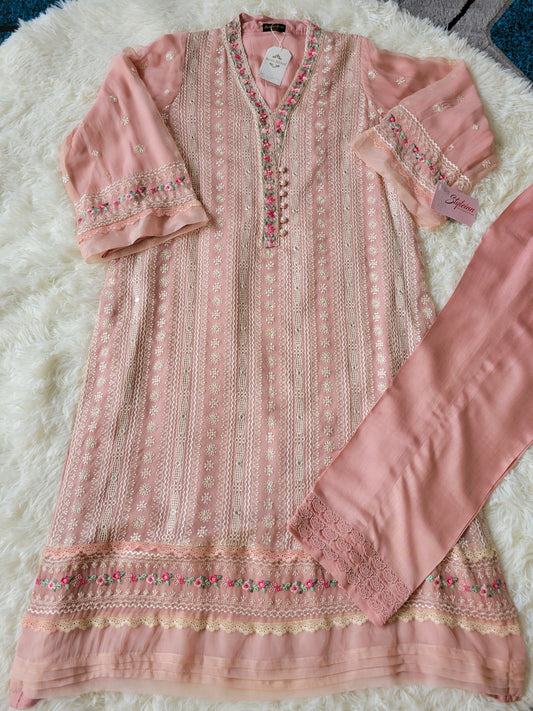 Blush Petals: Agha Noor Embroidered Peach Chiffon Dress