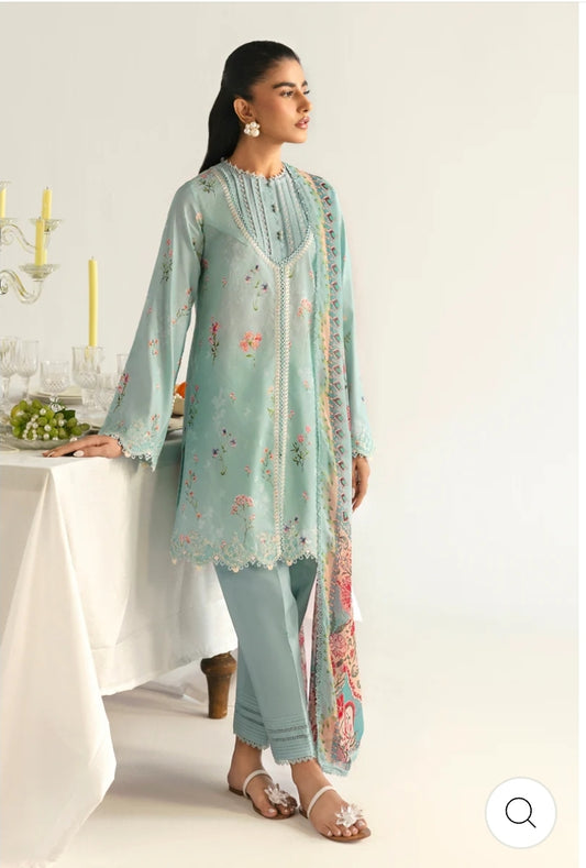 Qalamkar Ferozi Whisper: Printed Suit with Delicate Lace and Floral Dupatta