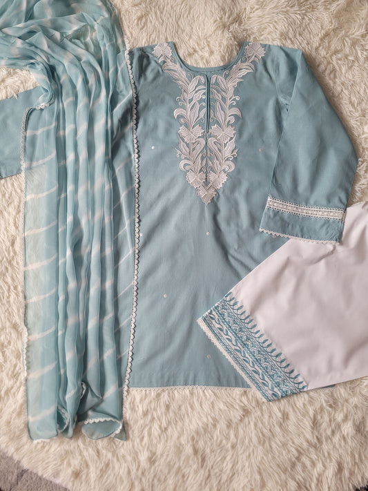 Aqua Bloom Serenade: Embroidered Suit with Striped tie dye Dupatta