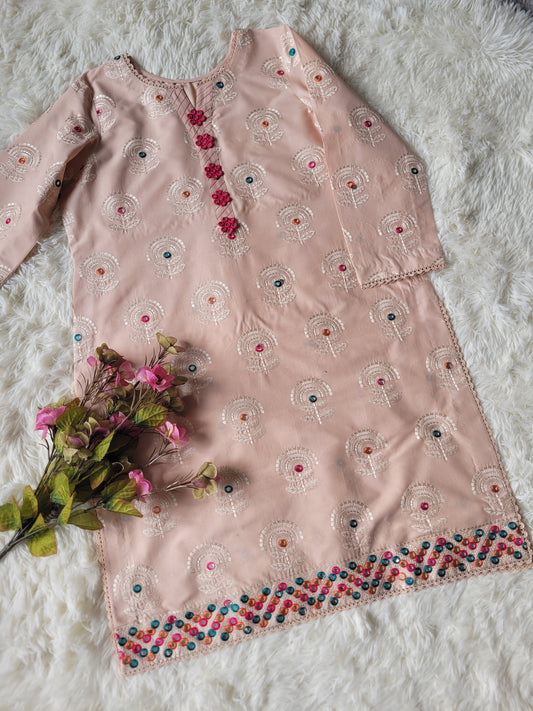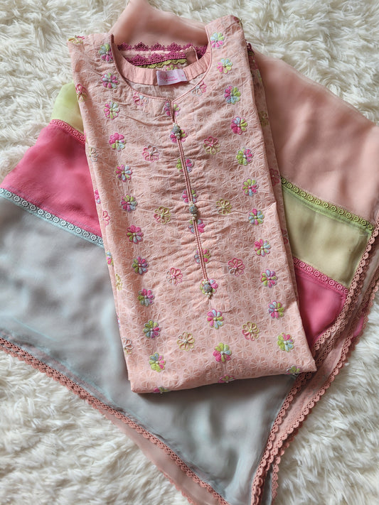 Peach Garden Bloom: Hand-Embroidered Suit with Multi-Hued Dupatta