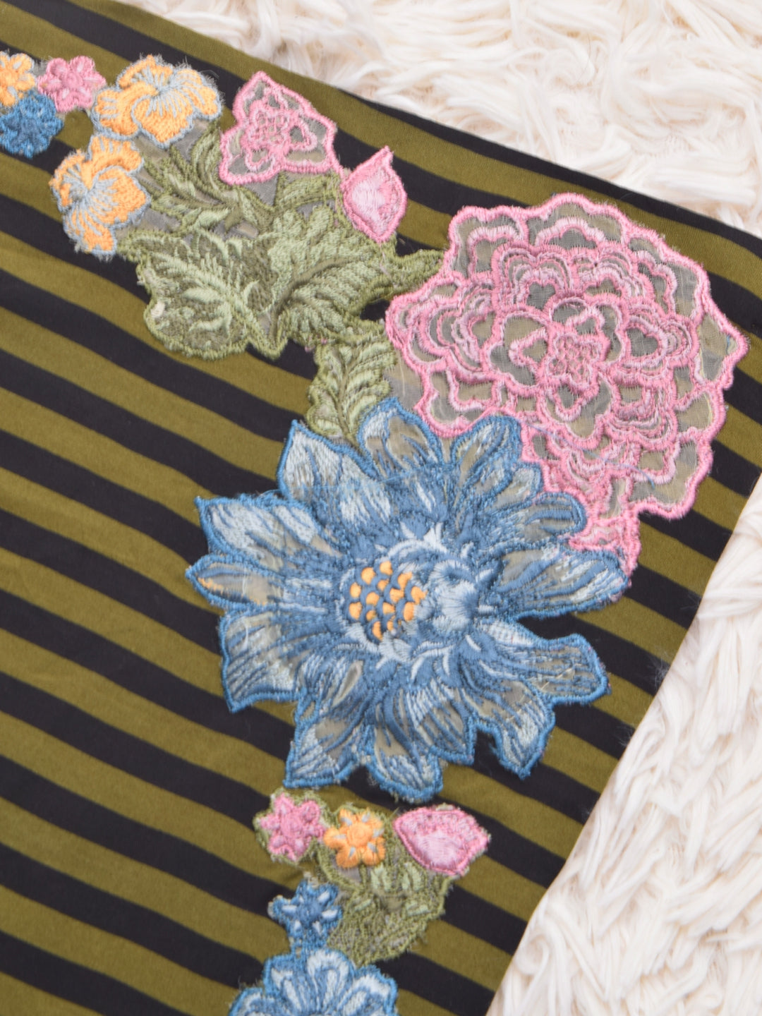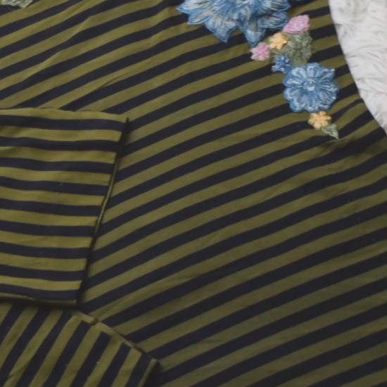 This stylish Linen kurta features a striking vertical stripe print in Olive Green and black. The classic design is beautifully elevated by vibrant floral embroidery on the bottom right corner, adding a burst of color and unique detail to this modern piece.