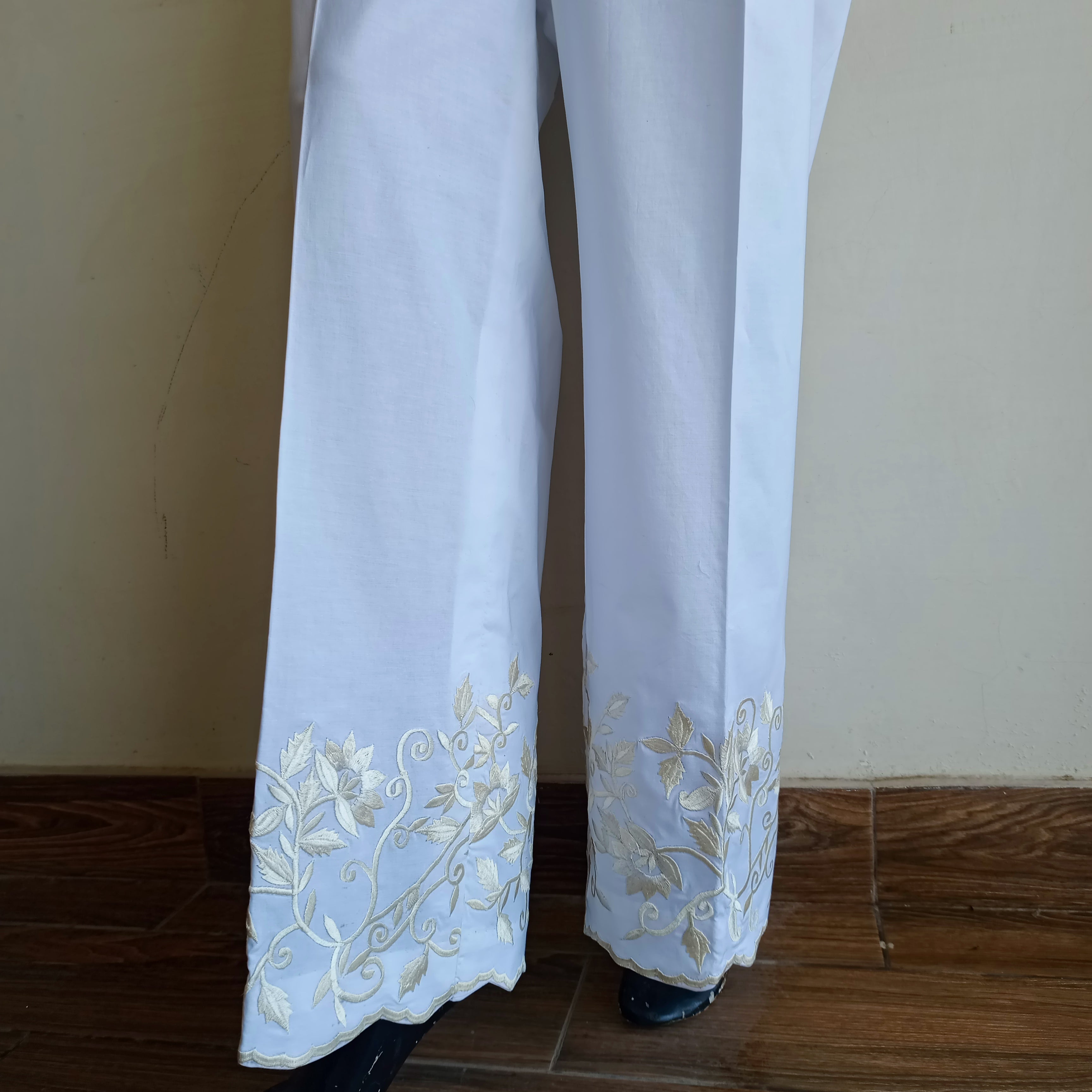 Elevate your traditional attire with this exquisite ivory cotton shalwar, a testament to timeless elegance. Crafted from soft, breathable fabric, this piece features a magnificent band of rich gold-toned embroidery gracing the cuffs. The intricate needlework depicts an enchanting floral vine pattern, complete with delicate blossoms and swirling leaves, all meticulously stitched for a luxurious, raised texture. The scalloped hemline, also adorned with matching embroidery, adds a final touch of refined charm. Designed for both comfort and sophistication, this shalwar is a versatile addition, perfect for pairing with a variety of kurtas for any occasion.