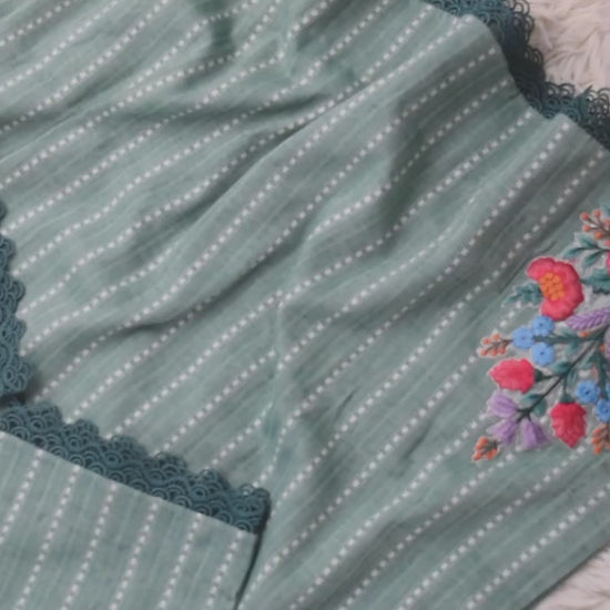 This stylish kurta is crafted from a soft Lawn/Cotton material, featuring a delicate vertical stripe pattern on a calming Sage Green base. The piece is beautifully detailed with a white lace-trimmed placket and vibrant floral applique on the chest and lower corner, finished with dark green lace trim along the hemline.