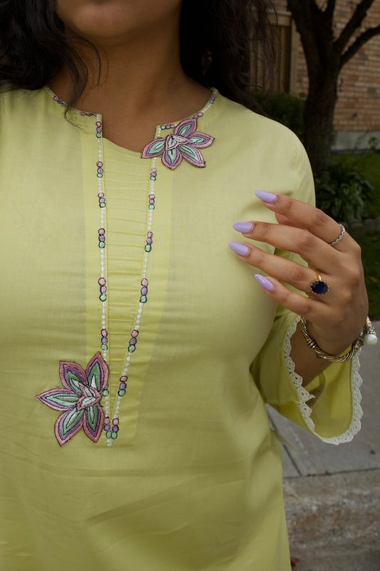 Lime Yellow with Blue Floral Print Kurta and Trouser
