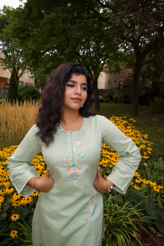 Green Bareeze & White: Embroidered Cotton Two-Piece Suit