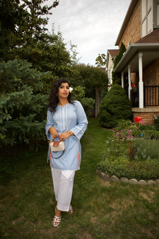 Light Blue & White: Embroidered Cotton Two-Piece Suit