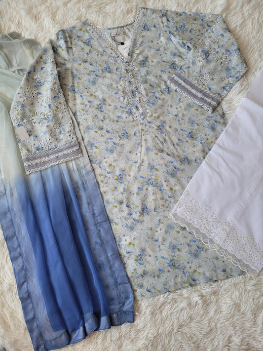 2 Pc Embroidered Suit Blue All Over Floral Print