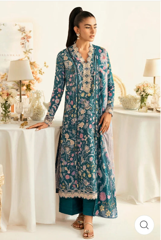 Qalamkar Teal Dream: Floral Lawn Three-Piece Suit