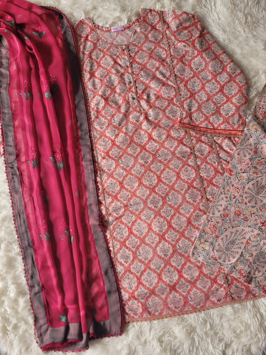 Zara Peach Medallion: Printed Shirt with Fuchsia Dupatta